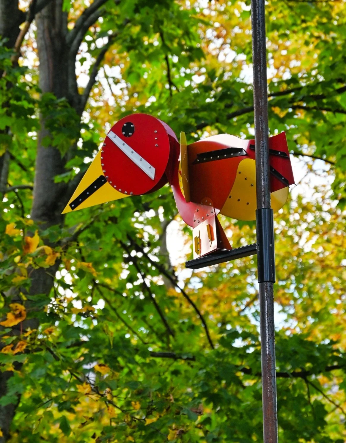 Initially made as a sample for a project proposal, the Switch Signal Bird is inspired by the shape and color of traditional railway switches. Today, the birds provide a colorful surprise around Waterbury, VT, and in the forests of the Trapp Family Lodge Outdoor Center, alongside its popular nordic ski trails.